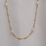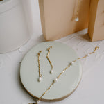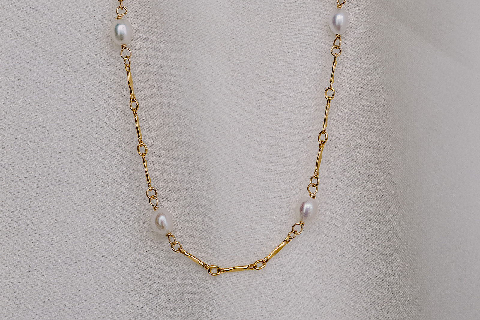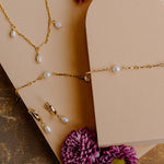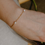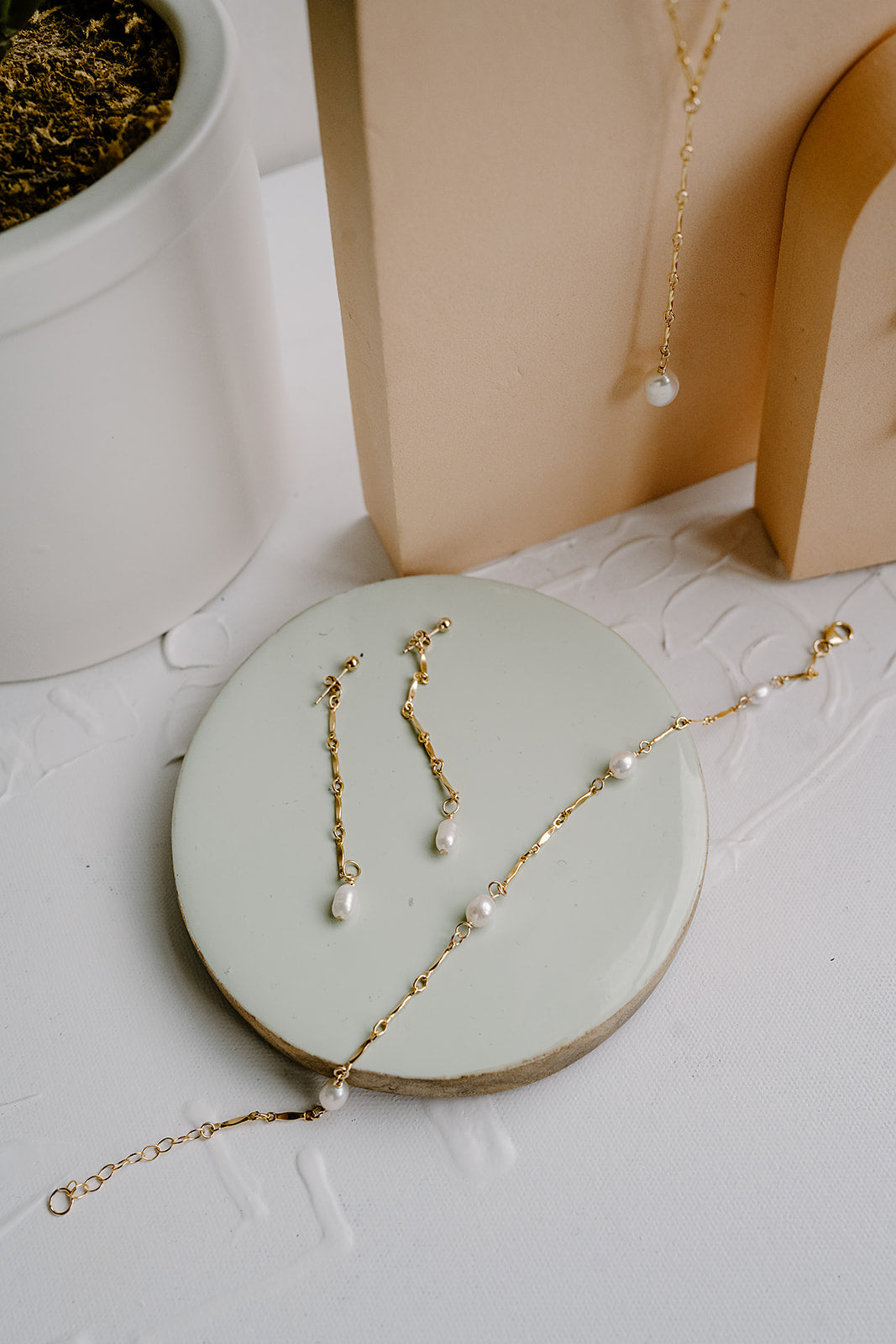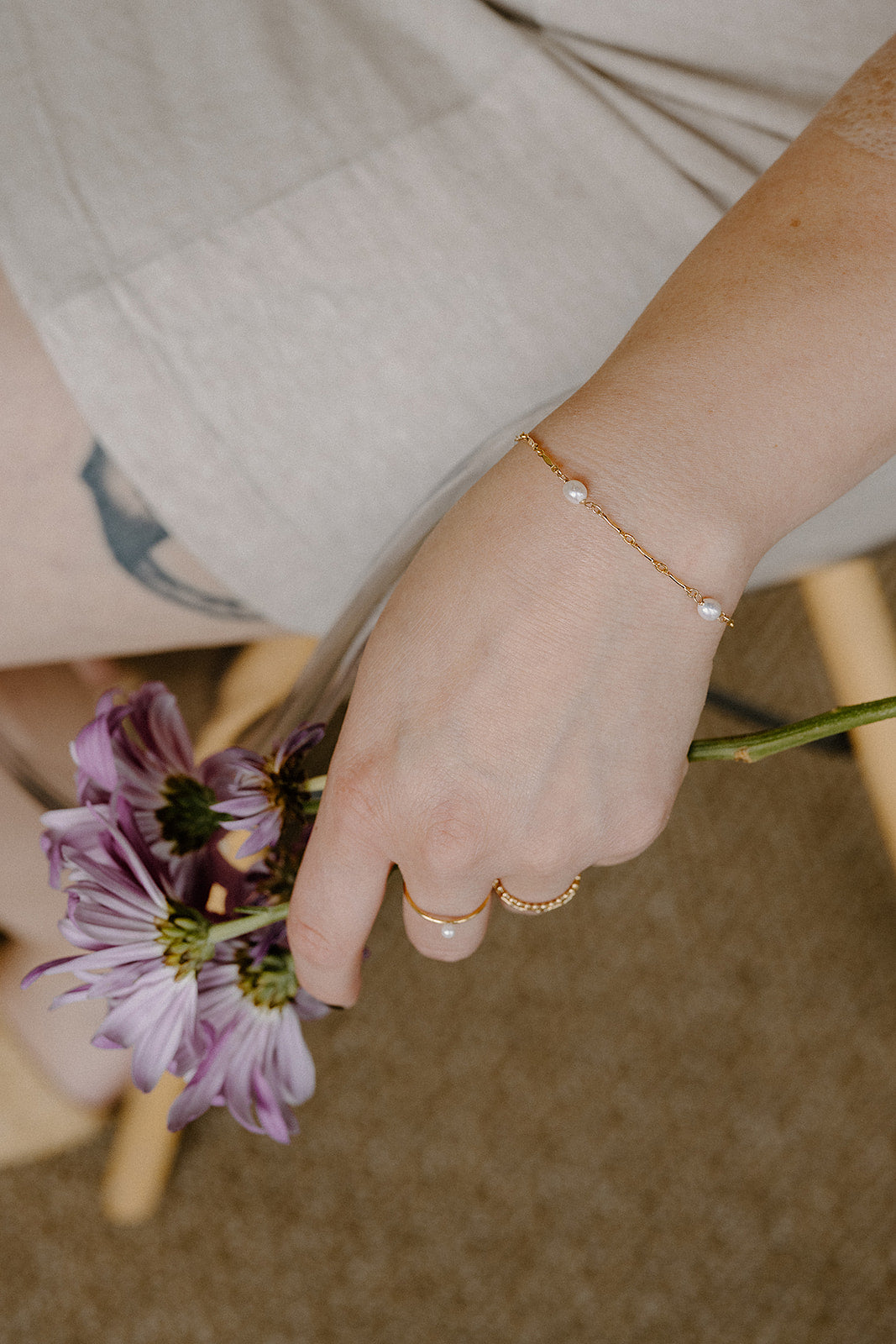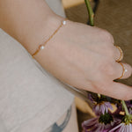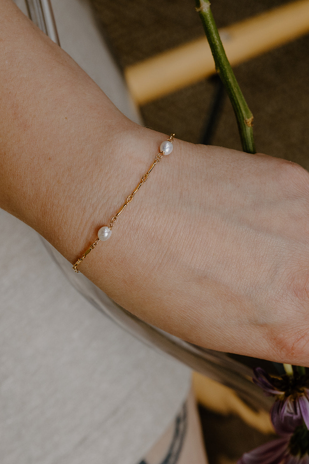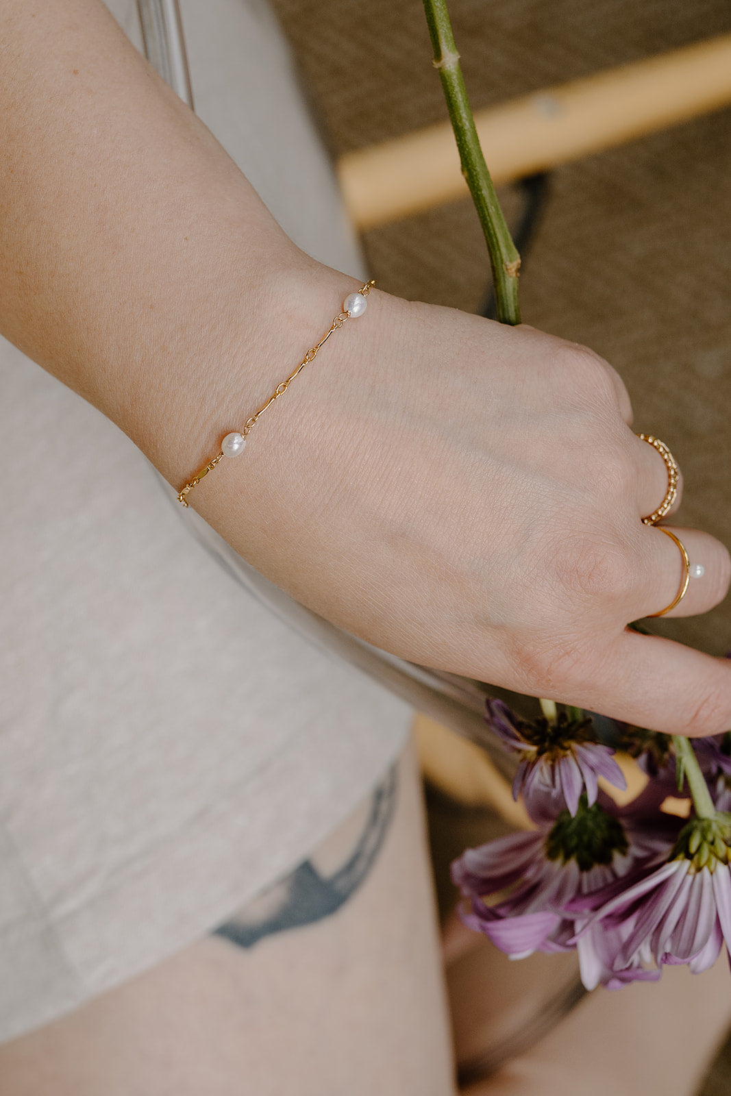 The kind of bracelet that makes your whole stack feel intentional. The Eden Pearl Bracelet features small freshwater pearls spaced along our Esme Sculpted Bar Chain — just enough detail to catch the eye, without begging for attention. It’s soft, feminine, and polished, but still feels easy and natural.