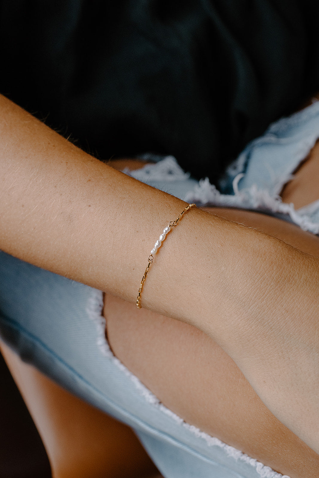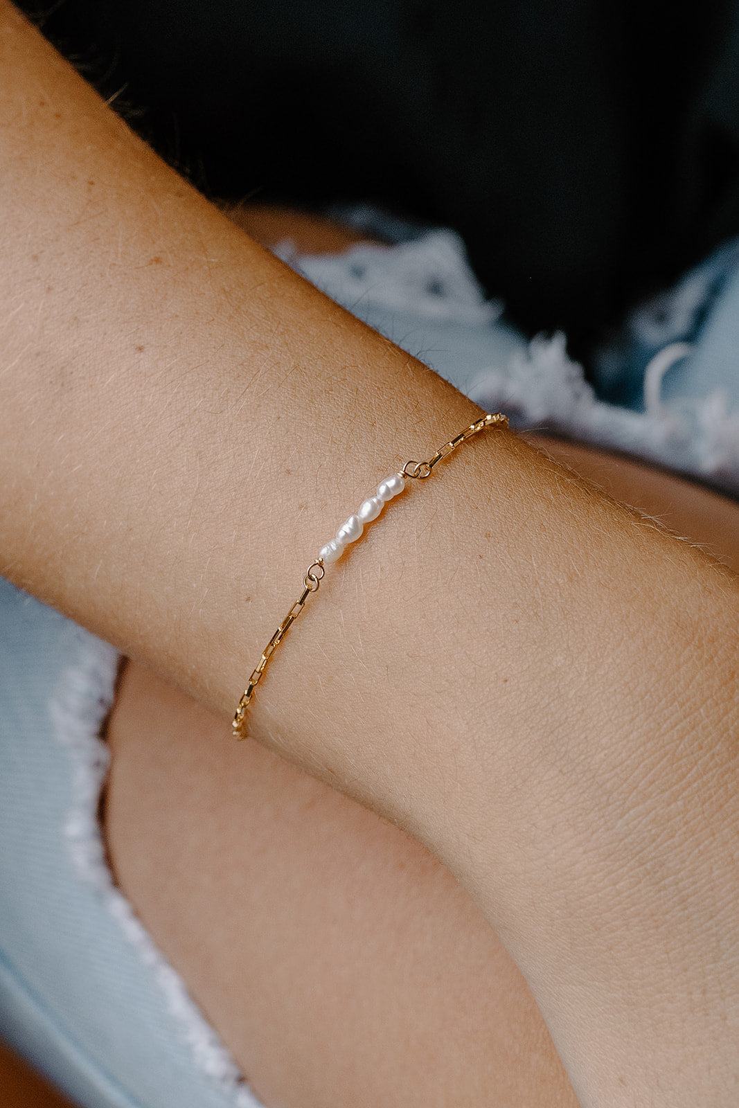 The Eden Pearl Quad Bracelet brings a flirty twist to your everyday stack with four petite freshwater pearls on our Arden Box Chain. It is 14k gold filled, lightweight, tarnish resistant, and made for the girl who wants something delicate but still noticeable. Easy to style and even easier to wear, it gives that polished, feminine shine you end up reaching for every single day.