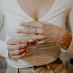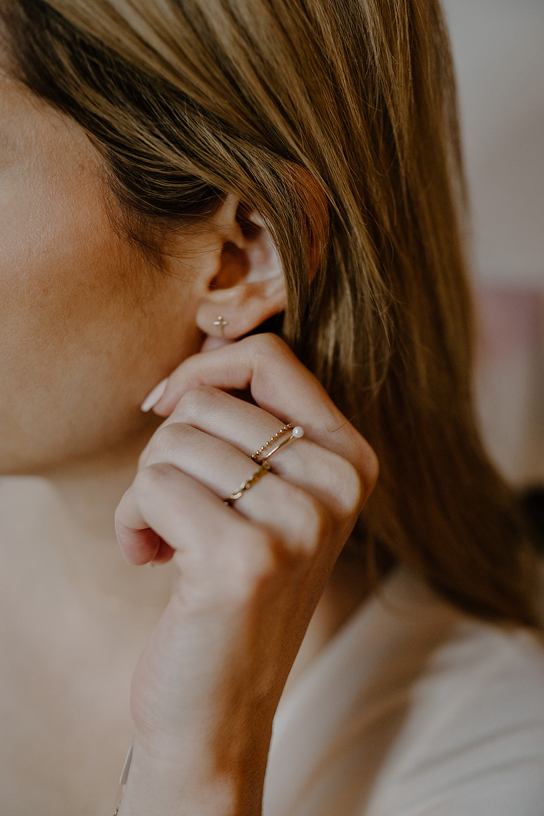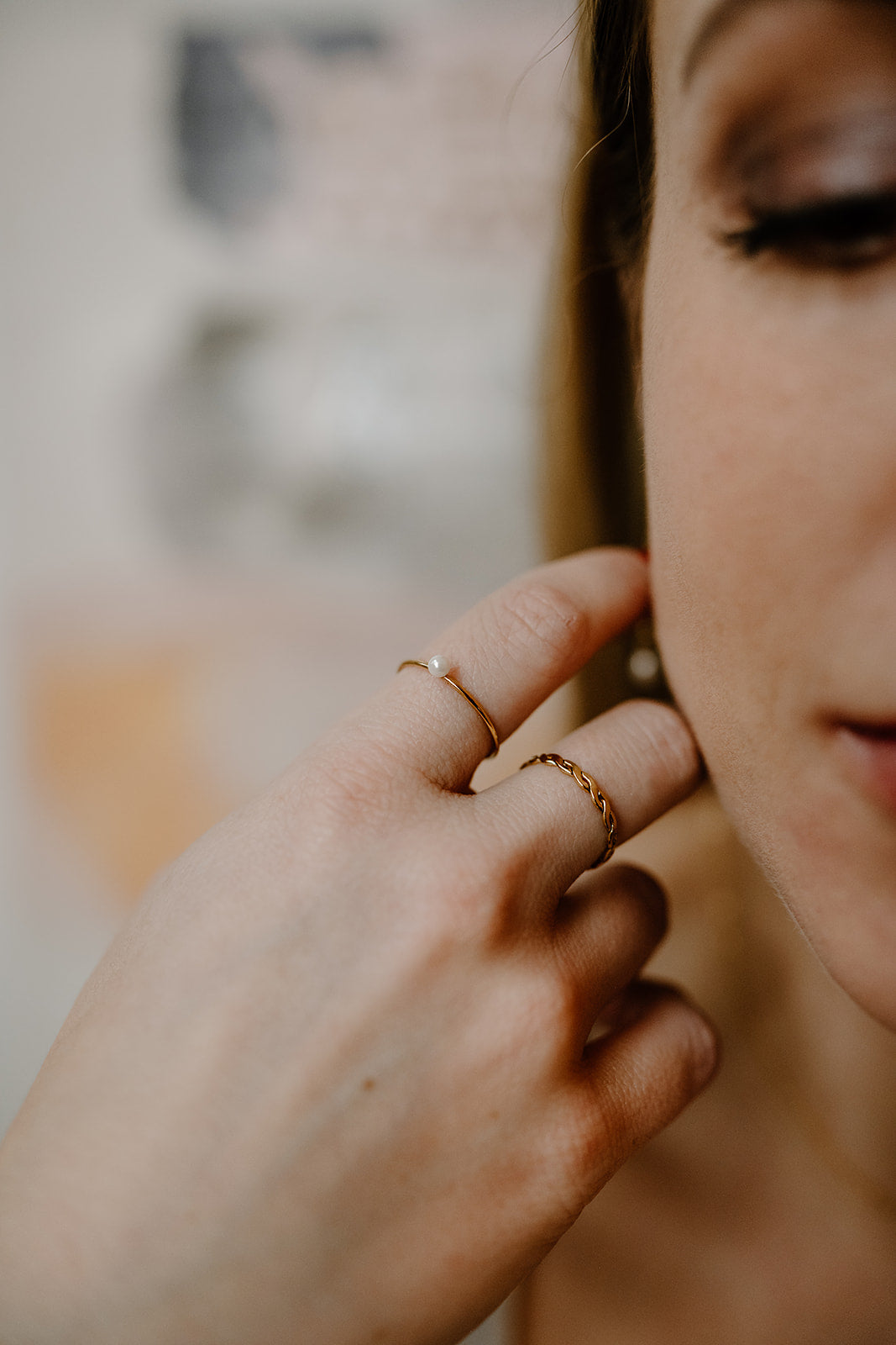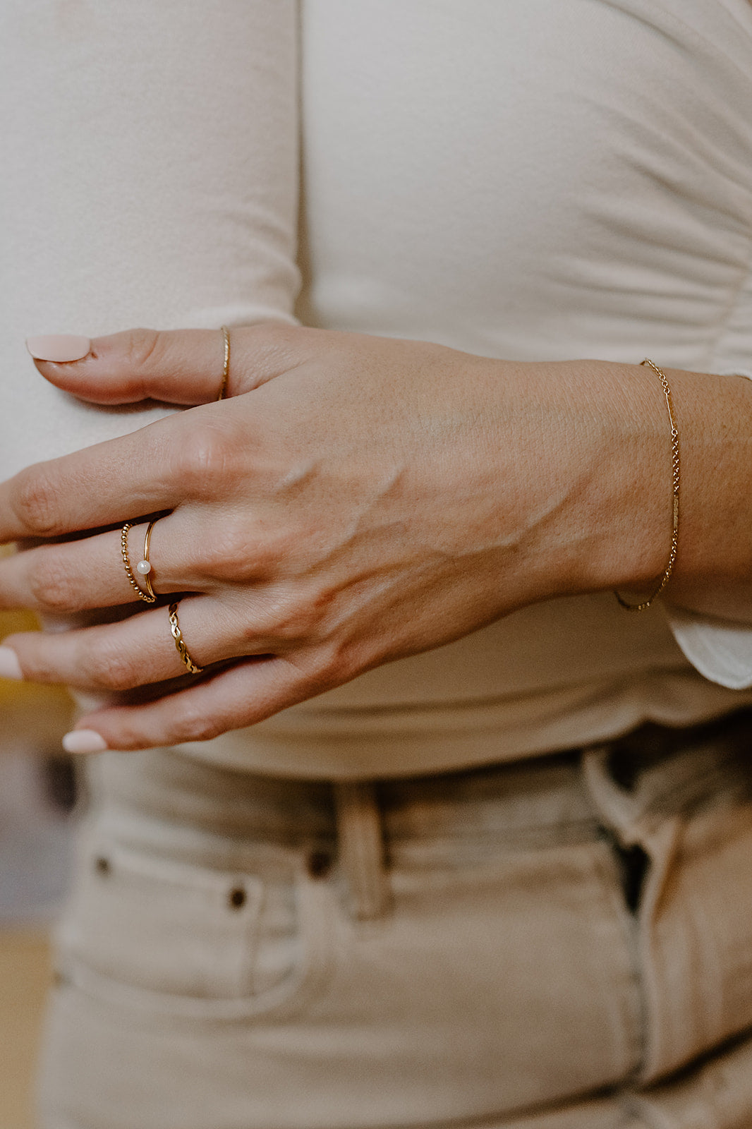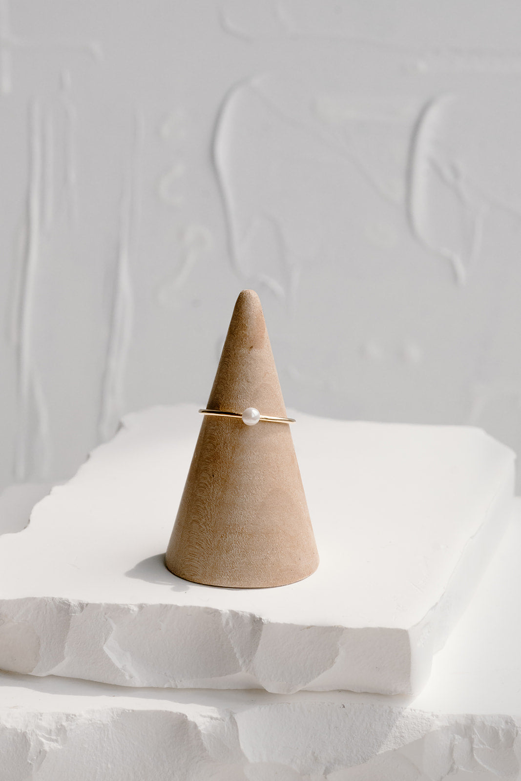 One pearl, endless ways to show off. The Eden Pearl Stacking Ring keeps it simple but striking — featuring a real freshwater pearl dangling from a sleek 14k gold-filled band.