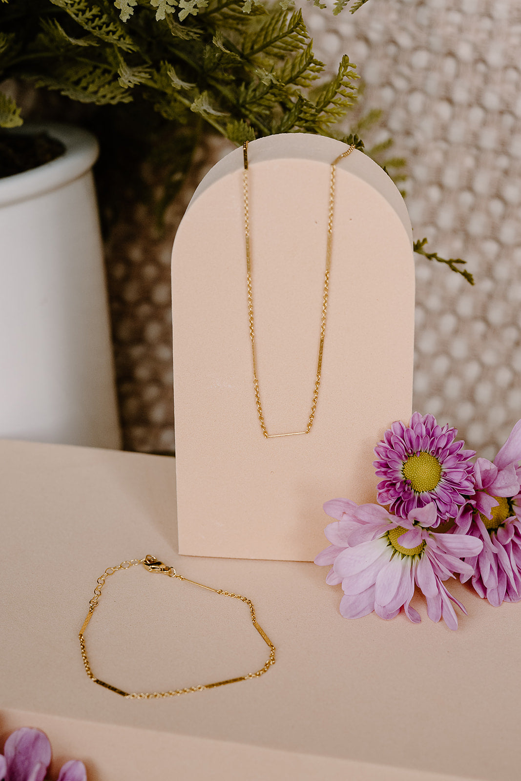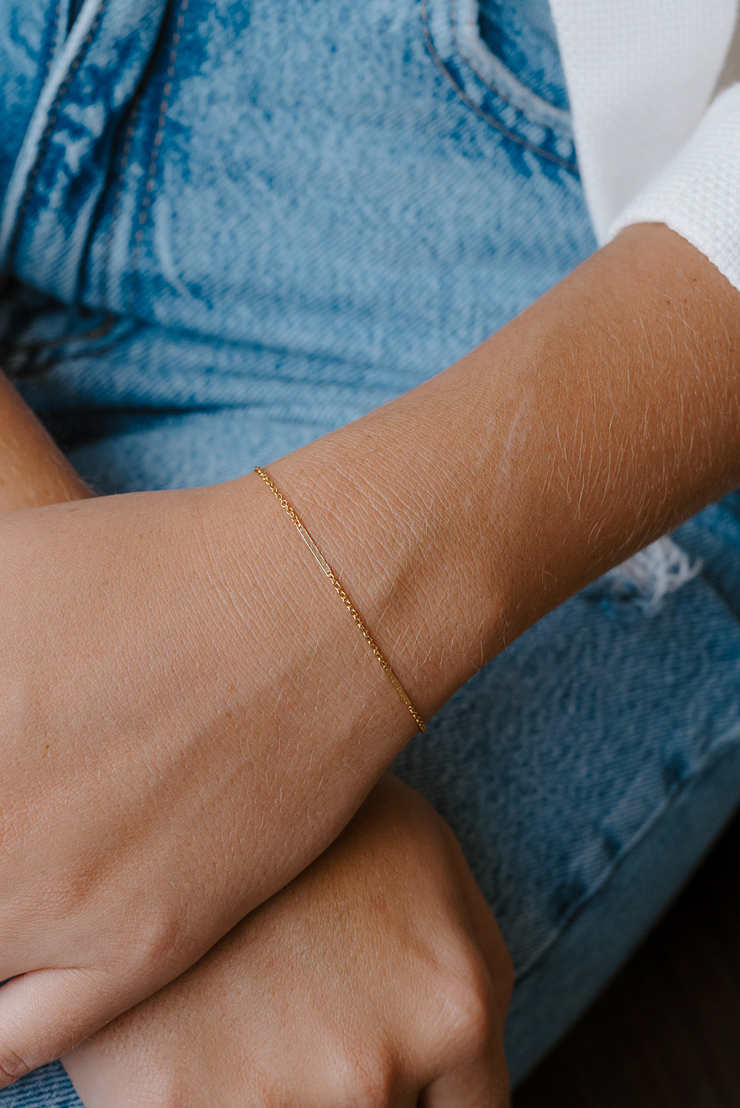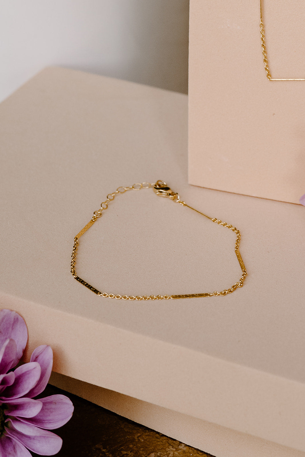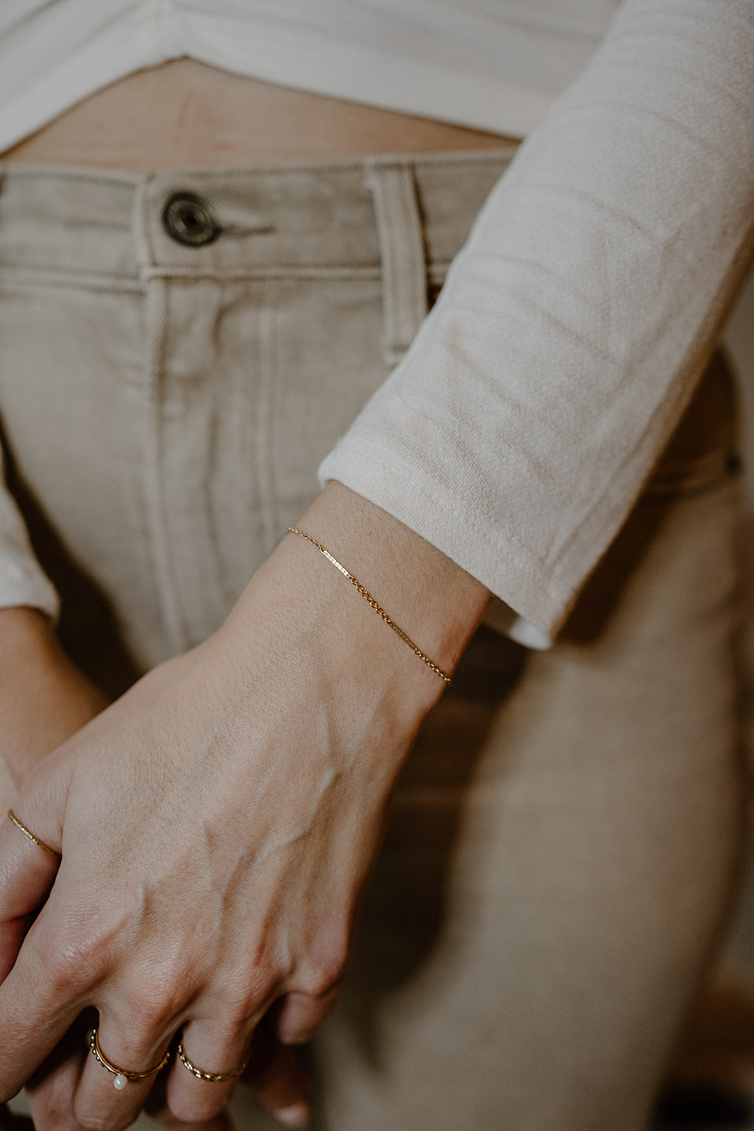 Consider the Elle Flat Bar Chain Bracelet your new favorite wrist wingwoman. It’s delicate, yes—but not boring. A polished flat bar link adds just enough structure between the classic cable chain, giving it that low-key luxe look.