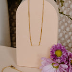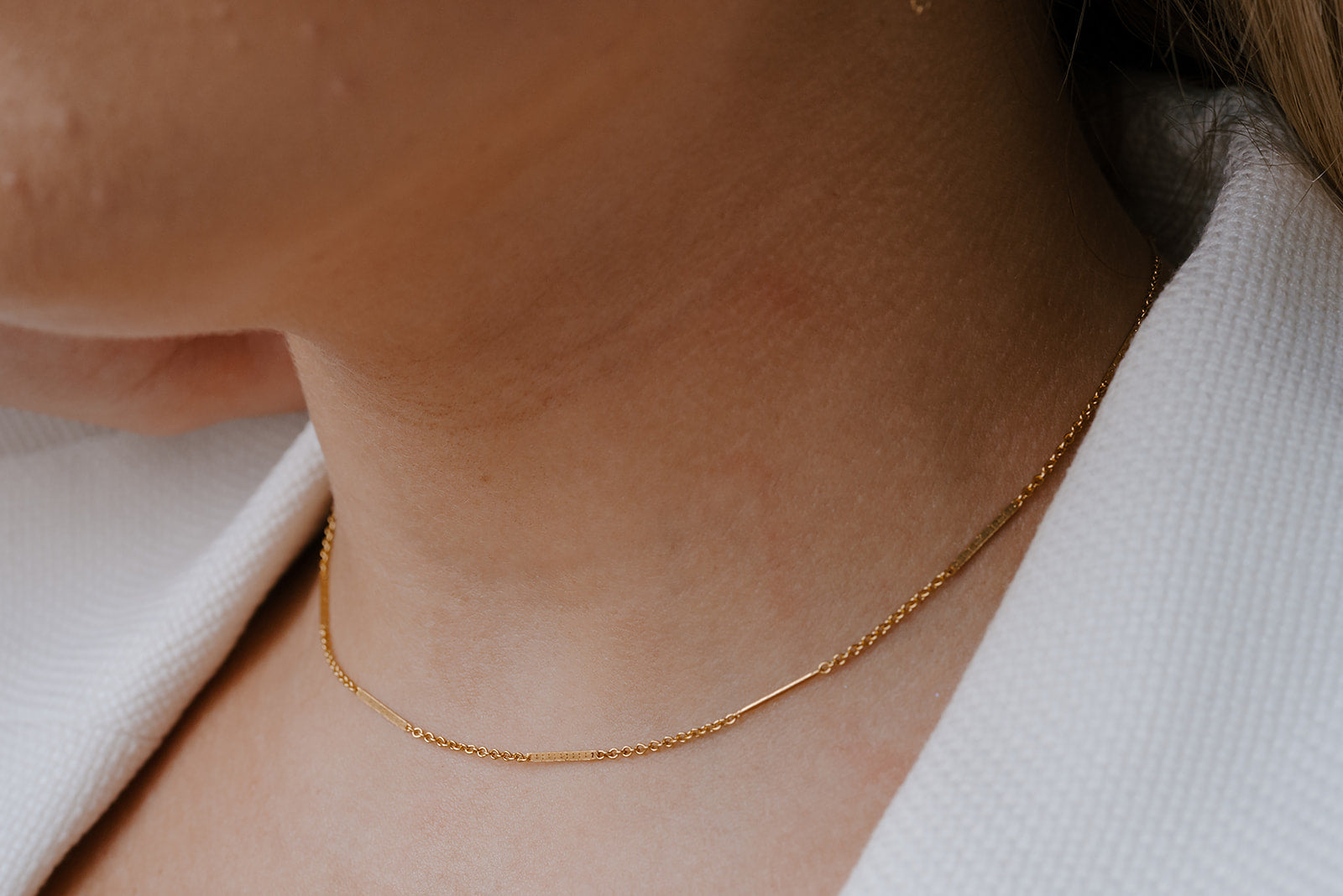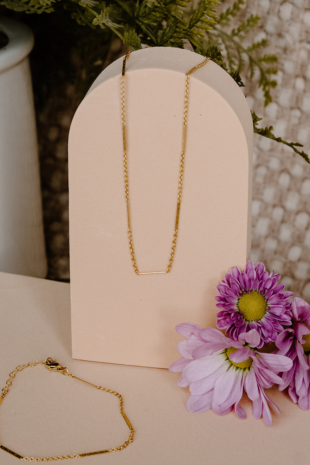 The Elle Flat Bar Chain Necklace keeps things sleek, simple, and just a little unexpected. With a bold flat bar gold or silver link nestled between classic cable chain, it’s the kind of piece that says “I have great taste” without actually having to say it.