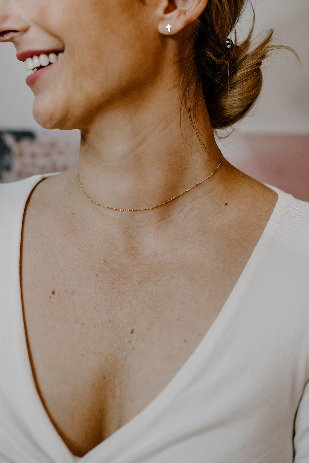 Sits just above the collarbone. A timeless, flattering length that works beautifully with almost any neckline — perfect for everyday wear.