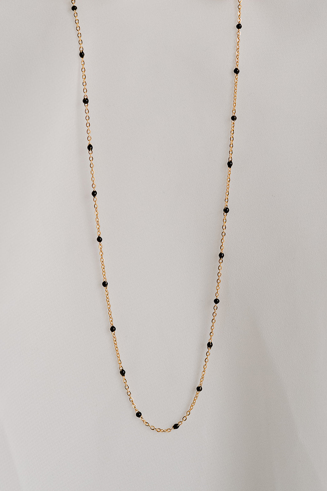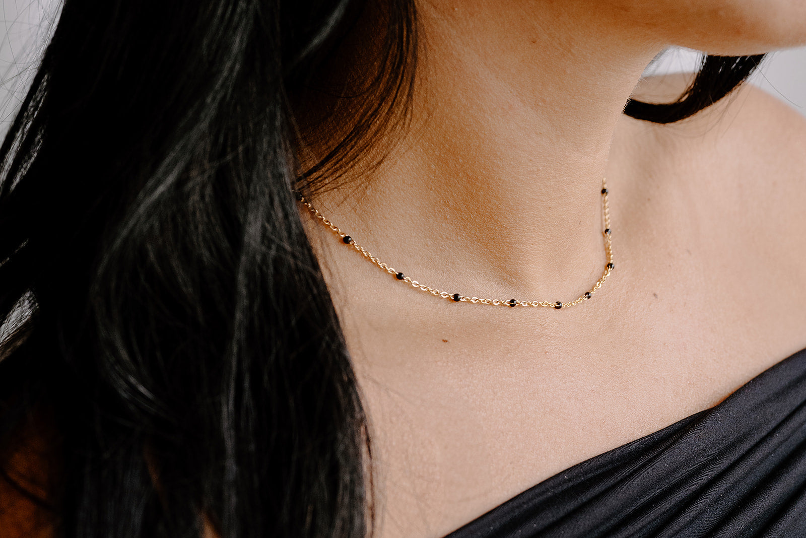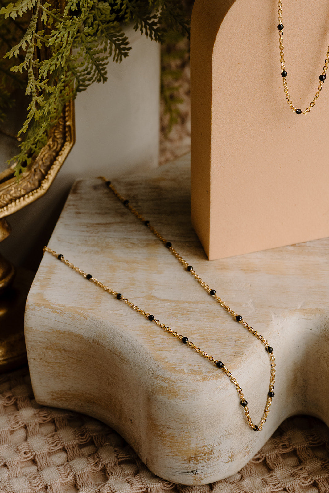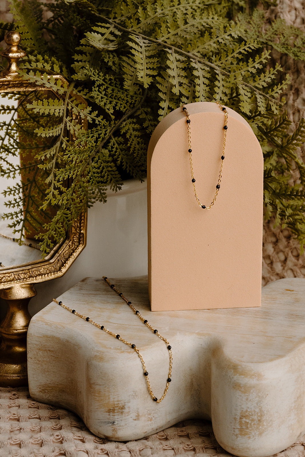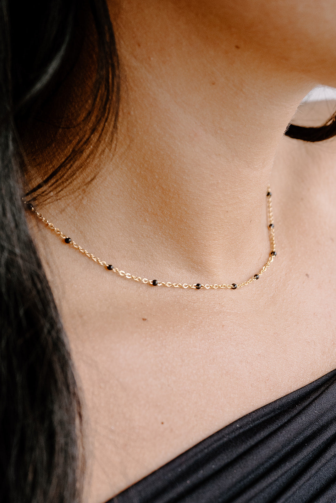 The Ellie Black Enamel Chain Necklace is the definition of effortless edge. Glossy black enamel beads with 14k gold filled or sterling silver links give this chain a sleek, modern vibe that plays just as well layered as it does solo. Handmade to order and part of our mission to give back to animal rescue, it’s a bold piece with a purpose.