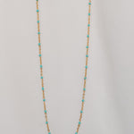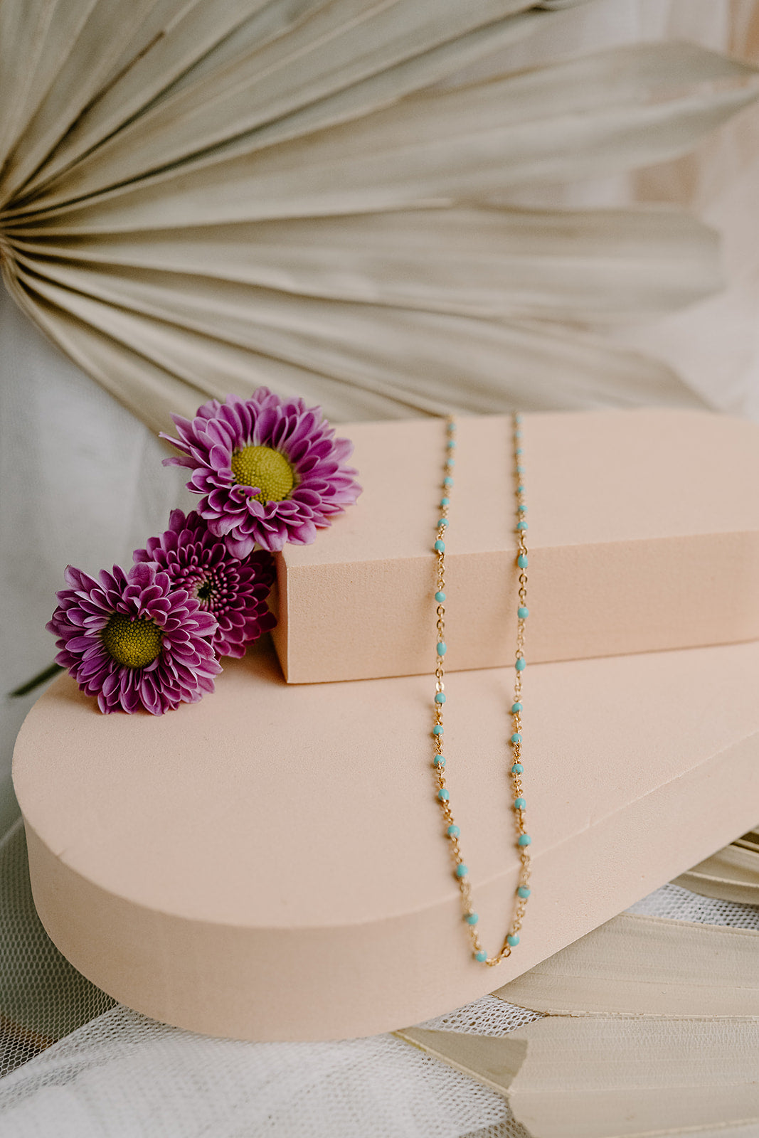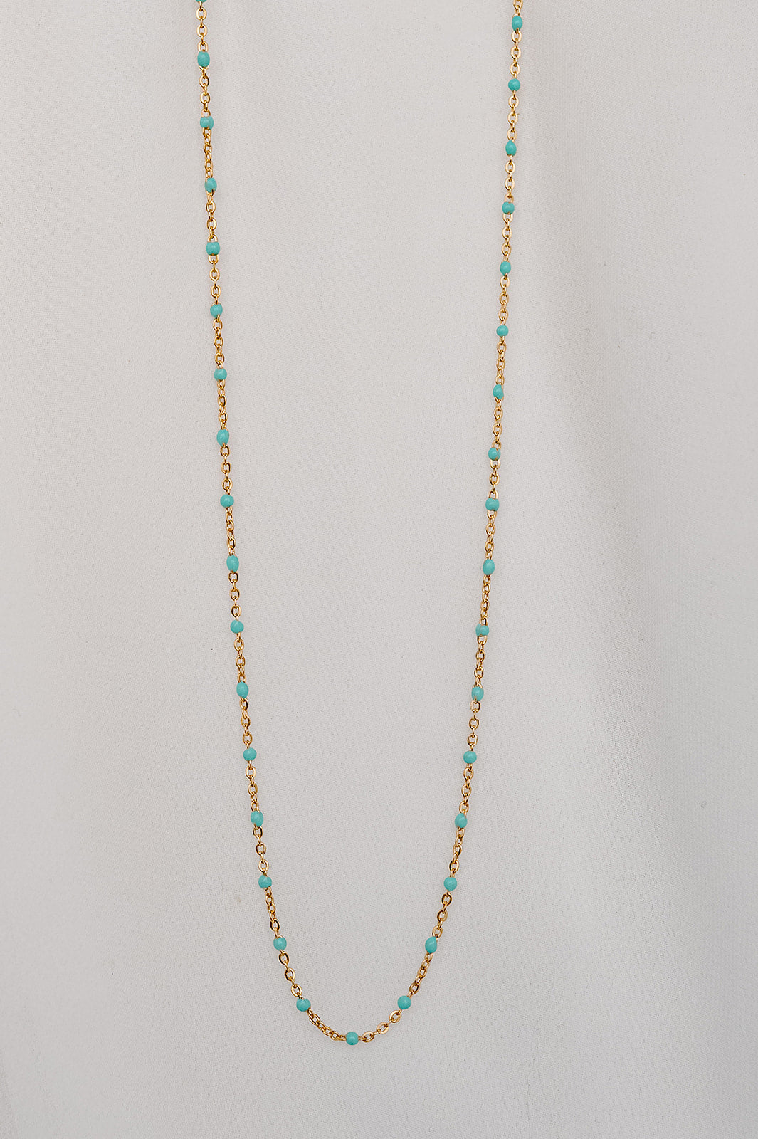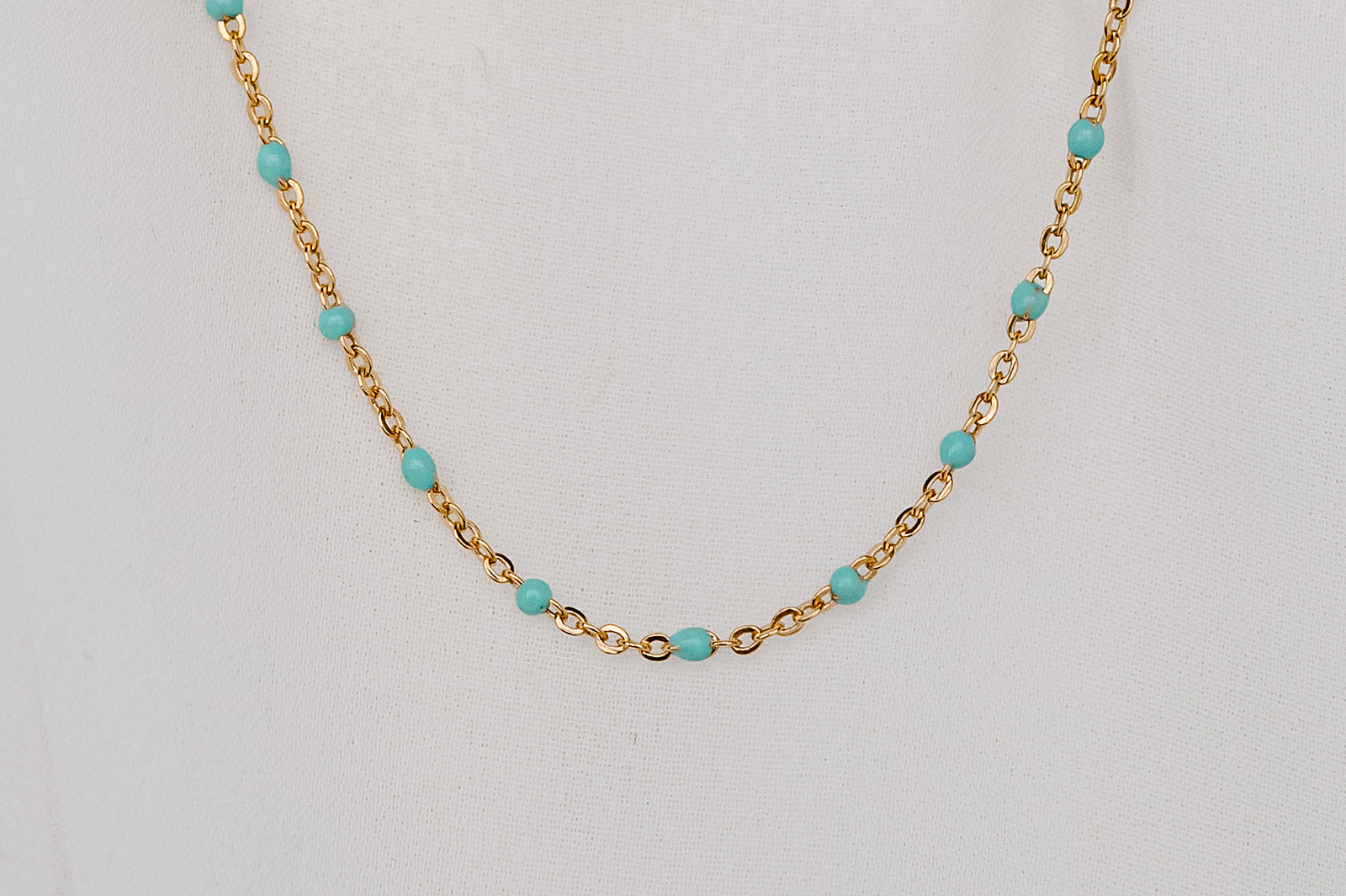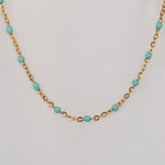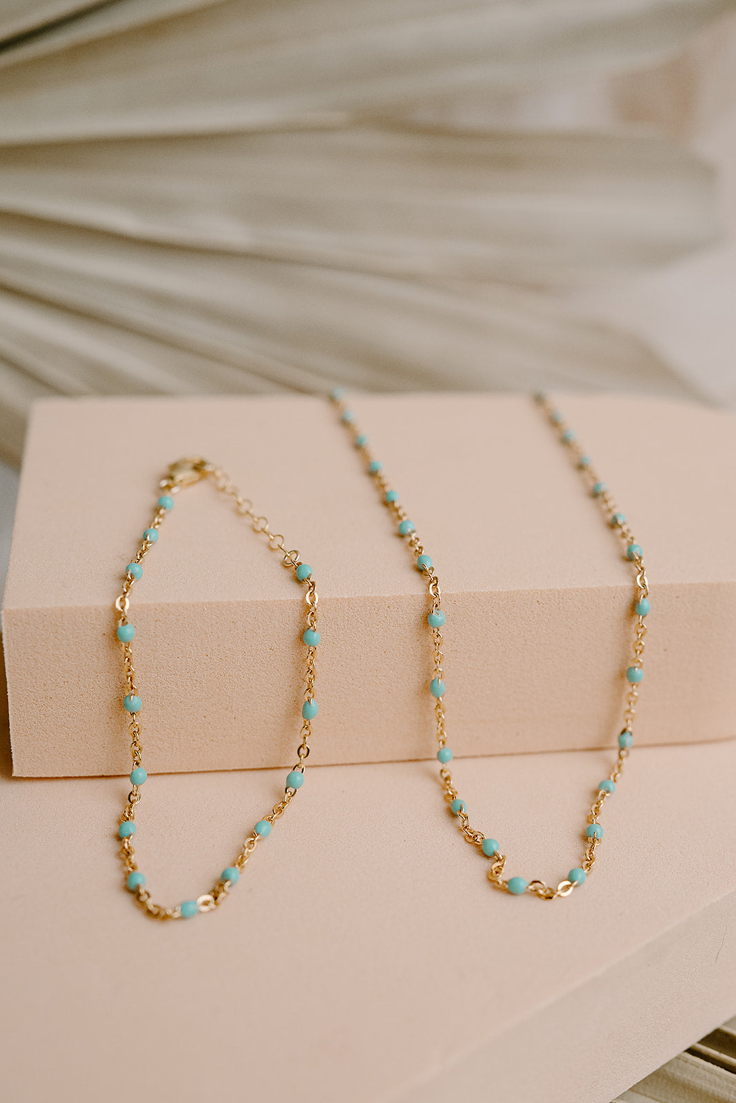 The Ellie Turquoise Enamel Chain Necklace is proof that color belongs in your stack. Turquoise enamel beads with 14k gold filled or sterling silver links give it that fresh, bold edge your jewelry lineup has been missing. Handmade to order and part of our mission to give back to animal rescue, this chain does more than look good — it feels good too.