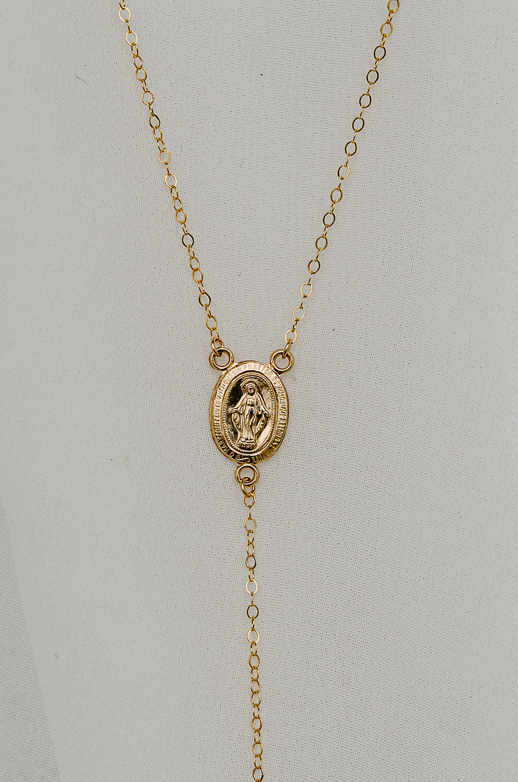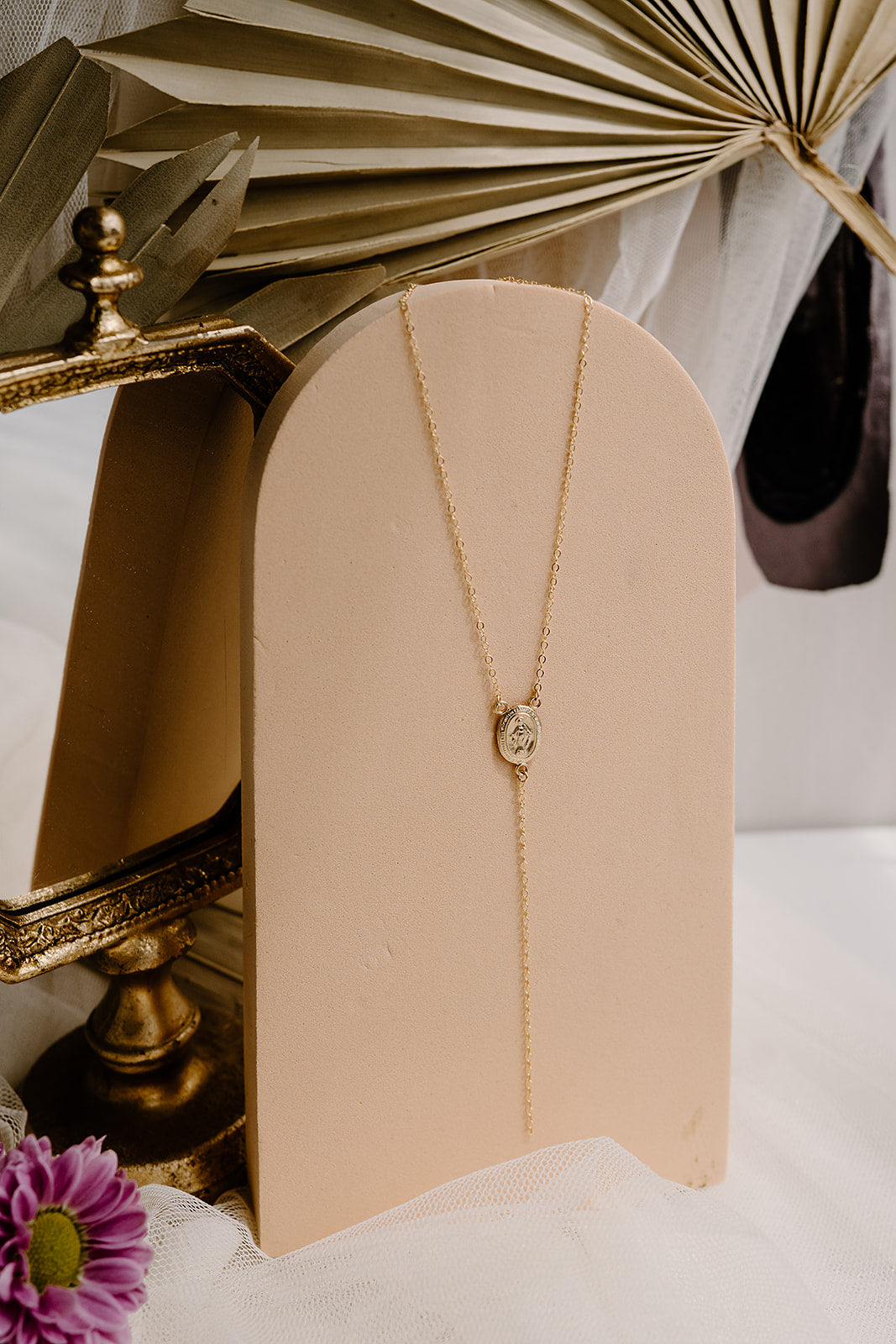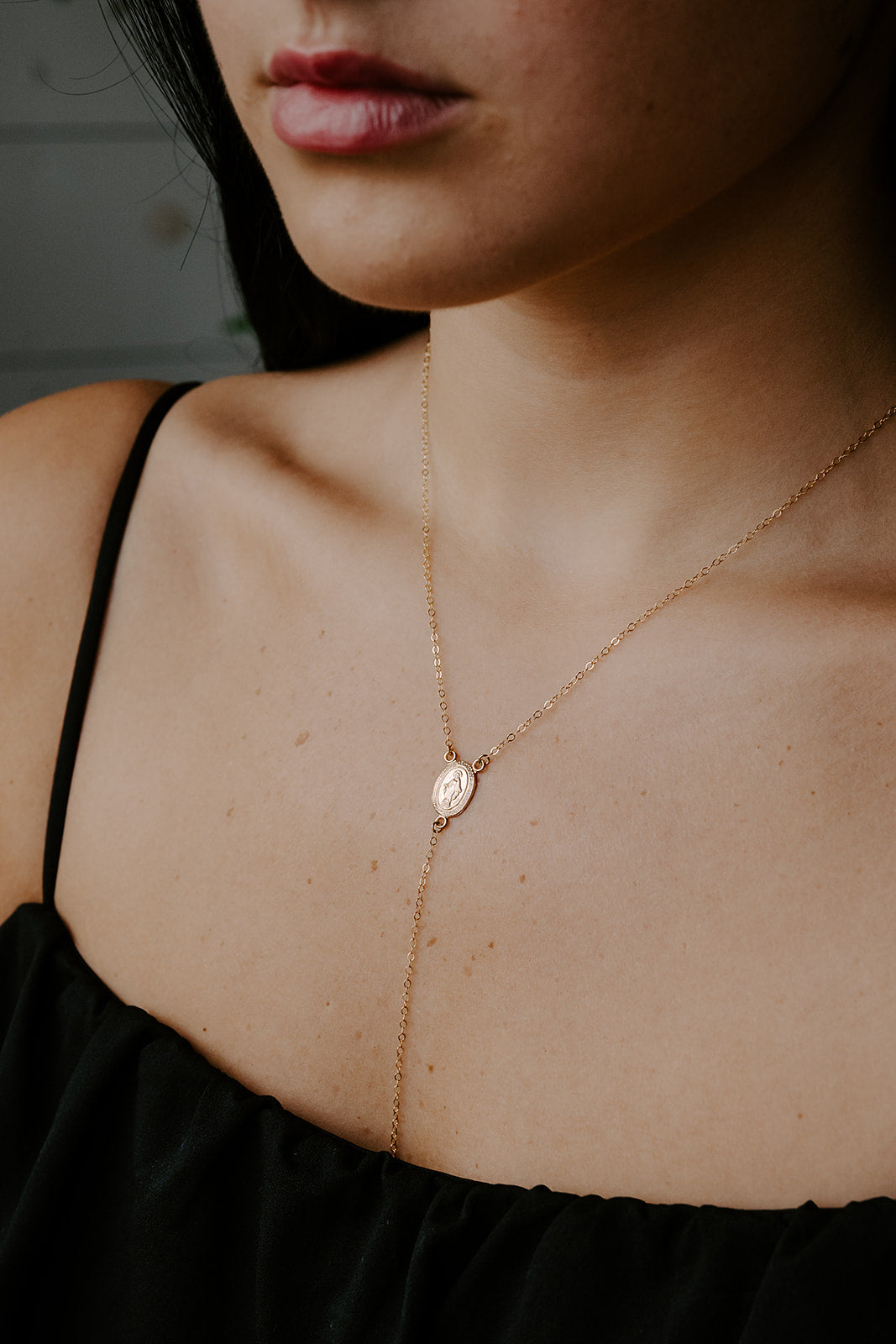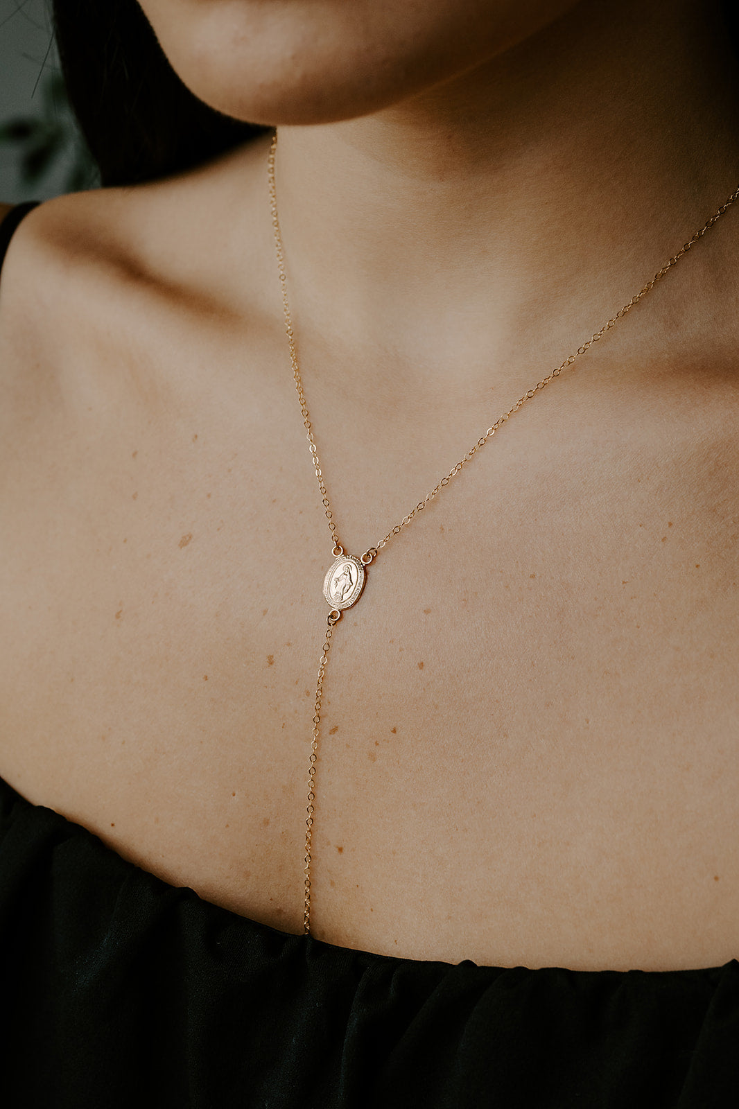 The Madonna Lariat is a modern, minimalist take on faith-inspired jewelry. A delicate Virgin Mary medallion rests at the center of a dainty drop-style chain, offering a quiet way to stay grounded and connected.