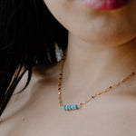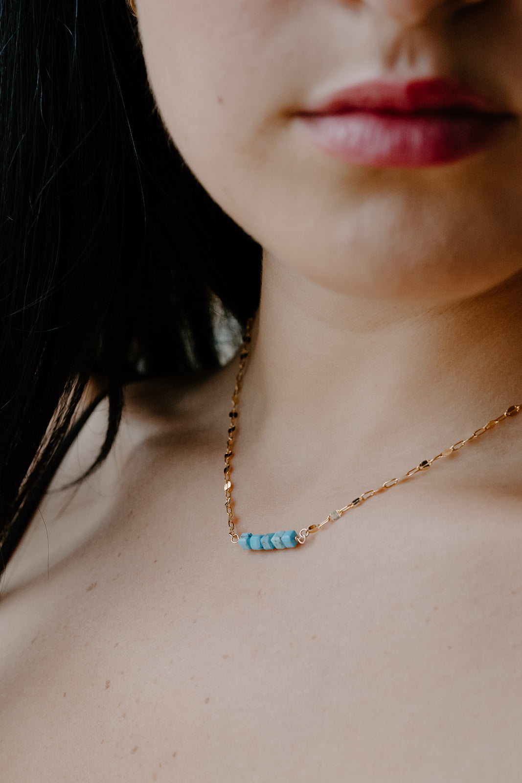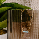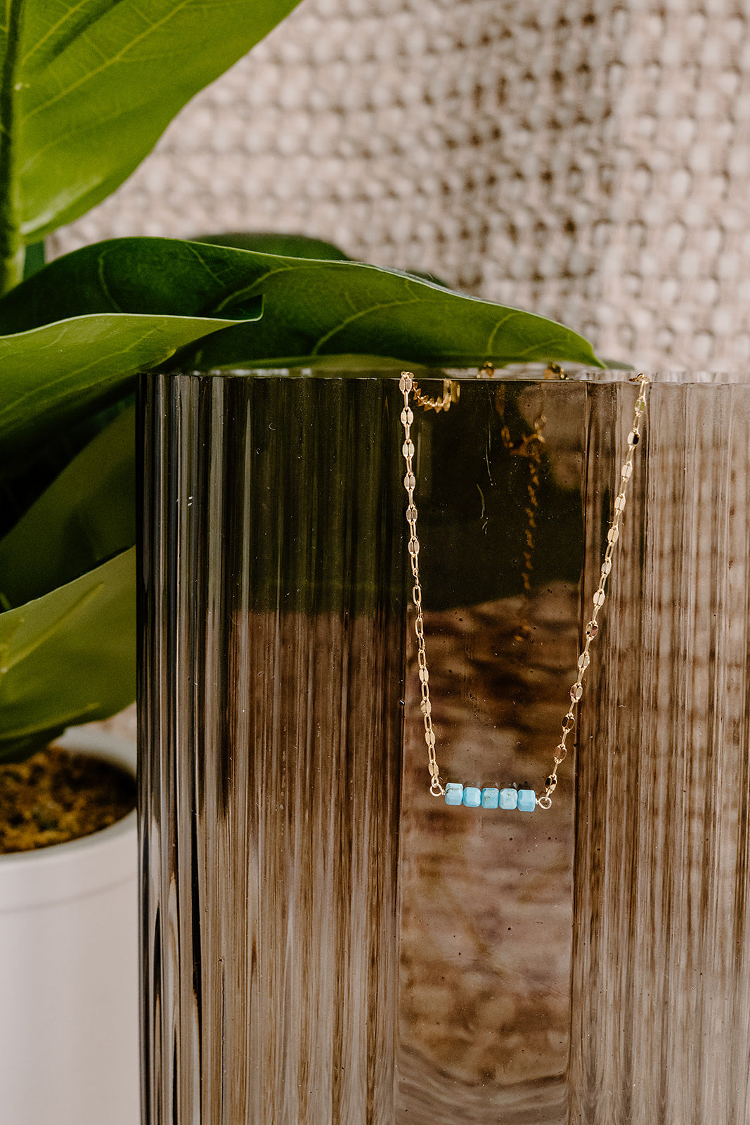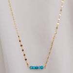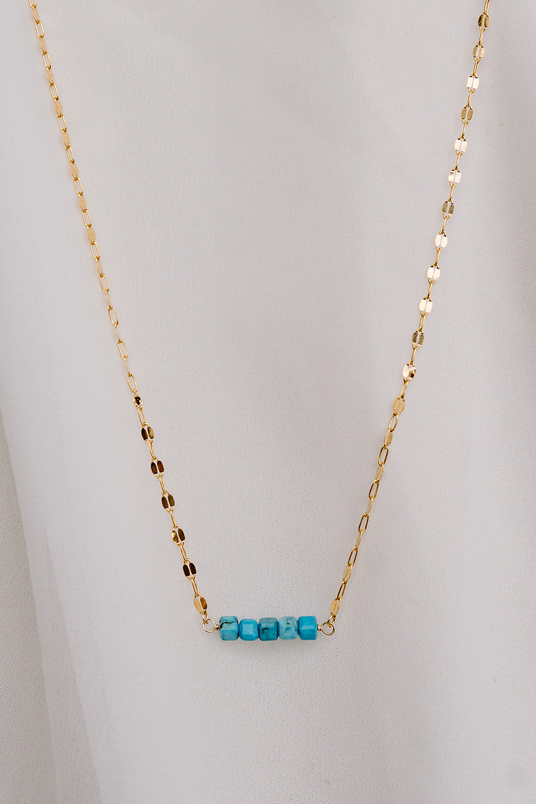 Turquoise isn’t just a color—it’s a whole mood. The Maris Turquoise Necklace brings five bold turquoise gemstones together on a flat, mirror-cut link chain with paperclip connectors that throw just the right amount of shine. The stones bring that punchy, go-with-anything pop of color, while the chain keeps it sleek and delicate so it plays nice with your layers. It’s modern, it’s summer-ready, and it’s the kind of piece that makes a white tee look styled and a sundress look extra.