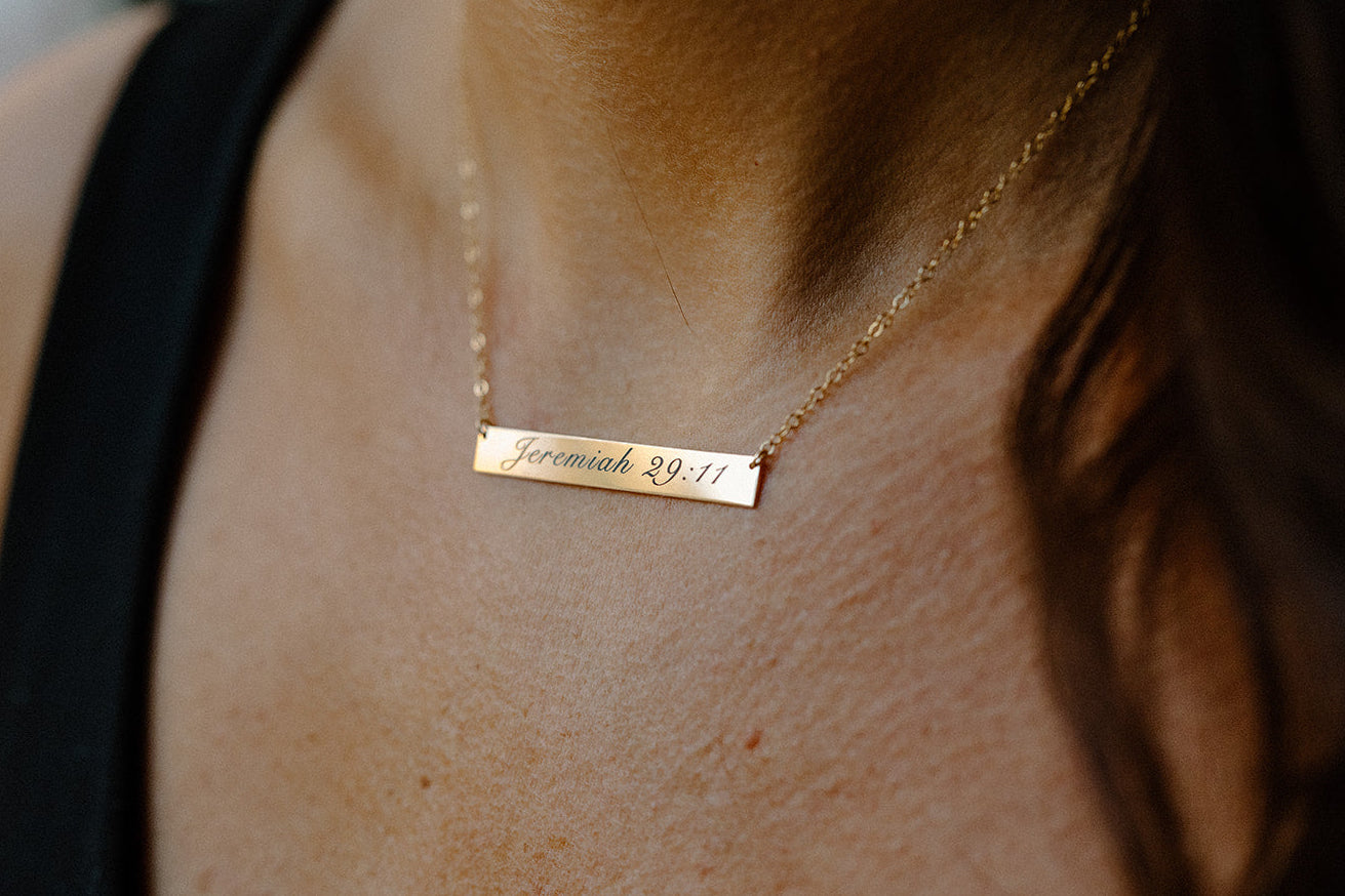 This minimalist bar necklace is custom engraved with a Bible verse, meaningful phrase, or word you live by. Designed to be worn daily, it’s a subtle reminder of what keeps you grounded, made to layer effortlessly or stand on its own.