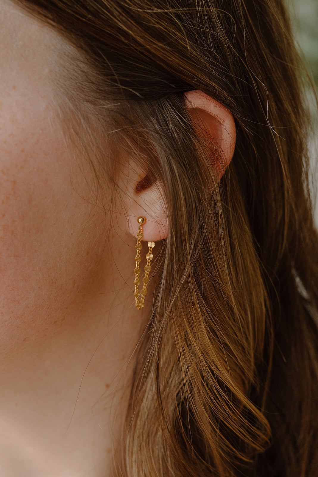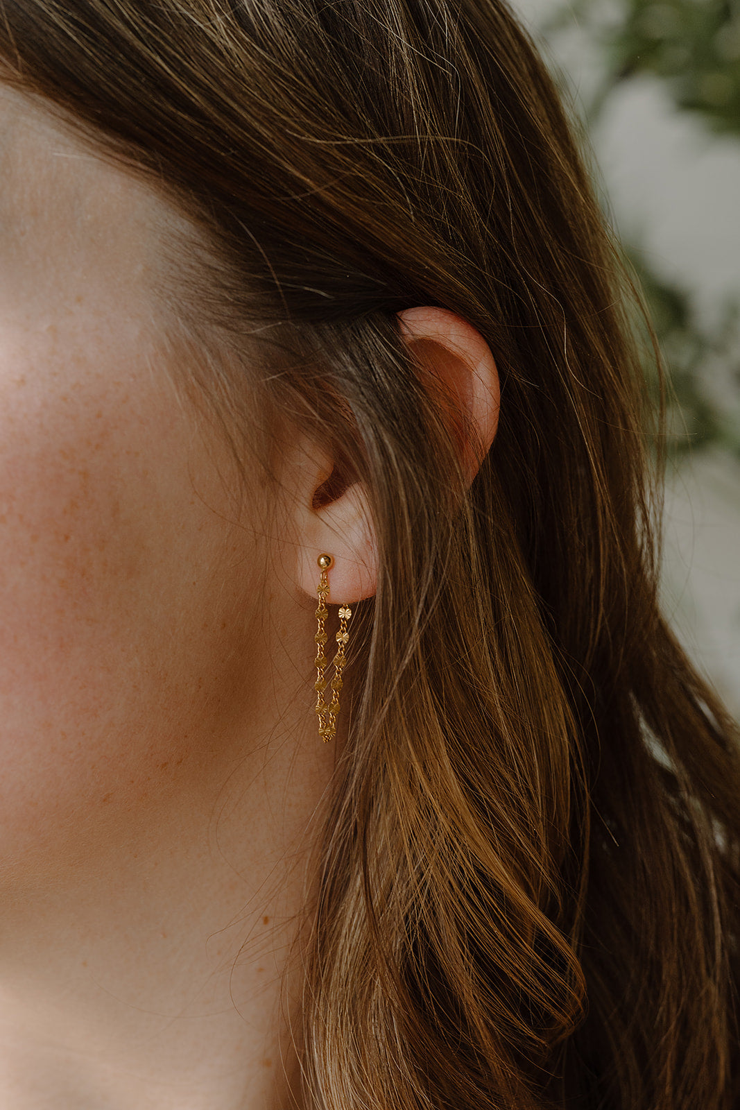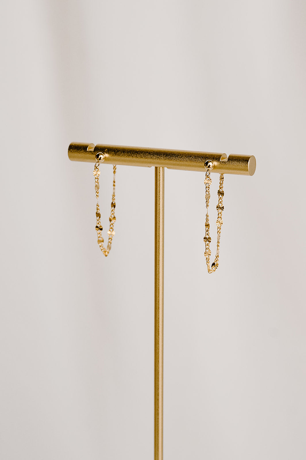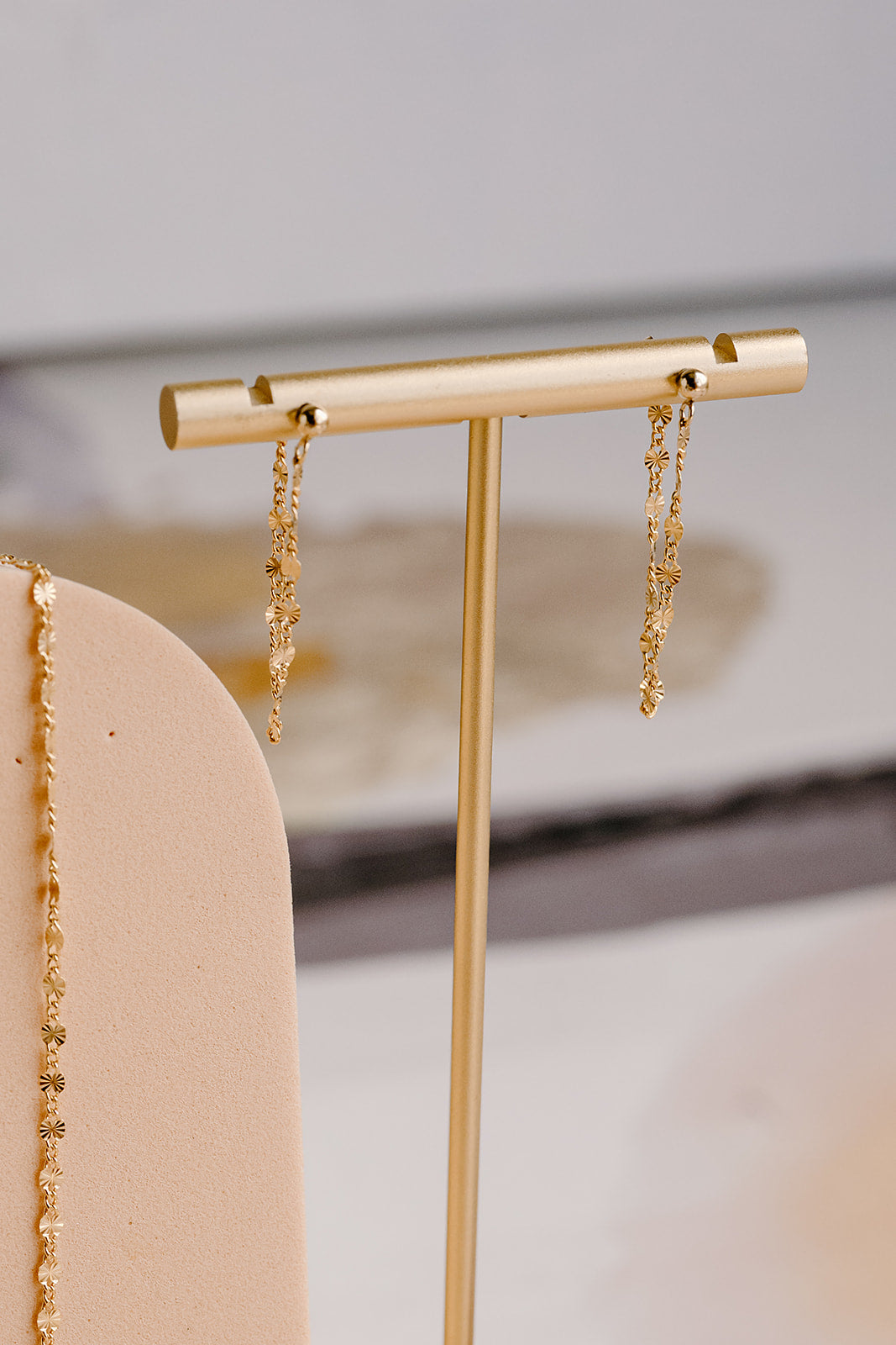 Crafted entirely from mini sunburst links, these lightweight drop earrings shimmer with every move for that just-right golden-hour shine. Handcrafted in 14k gold-filled or sterling silver, they’re waterproof, tarnish-resistant, and designed to stay bright wear after wear.