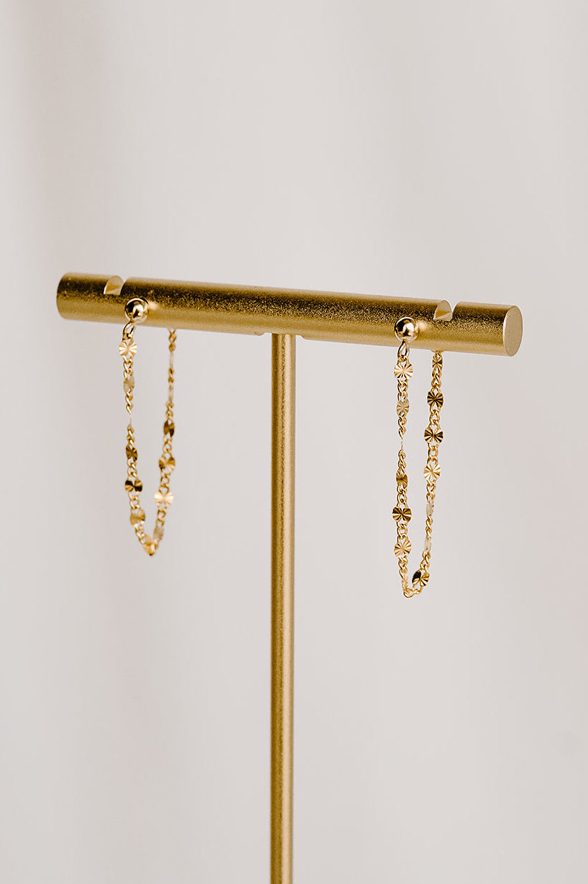 These handcrafted sunburst chain earrings feature mini sunburst links that catch the light with every move, creating a soft, golden-hour shine. Lightweight and easy to wear, they bring subtle movement and polish without feeling overdone. Crafted in 14k gold filled or sterling silver, they are tarnish resistant, low maintenance, and designed for everyday wear.