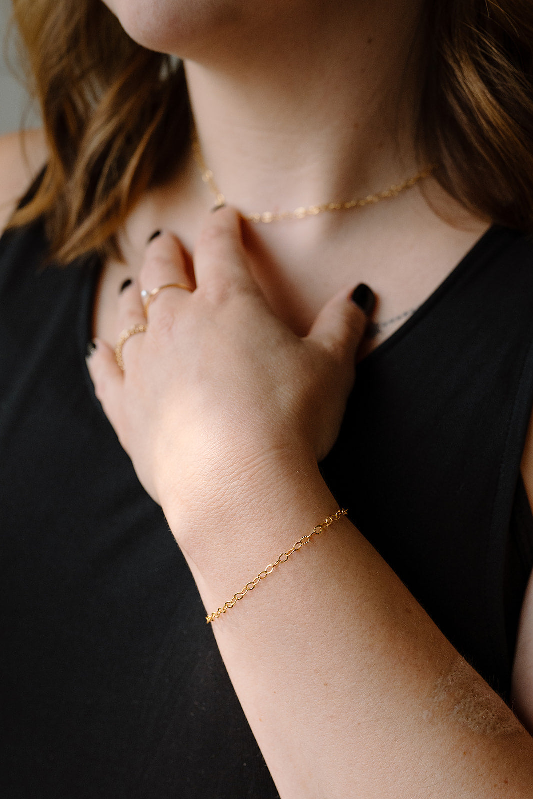 Crafted in 14k gold filled or sterling silver, it’s waterproof, tarnish-resistant, and built for nonstop wear. Easy to stack, effortless to style, and never trying too hard — just how we like it.