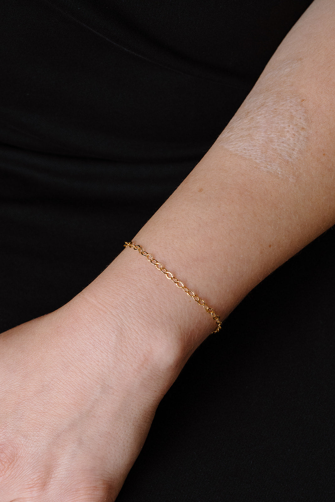 The Stella Shimmer Bracelet is all about understated radiance. Its delicate, textured links catch the light just enough to make people look twice — minimal, refined, and always in style.