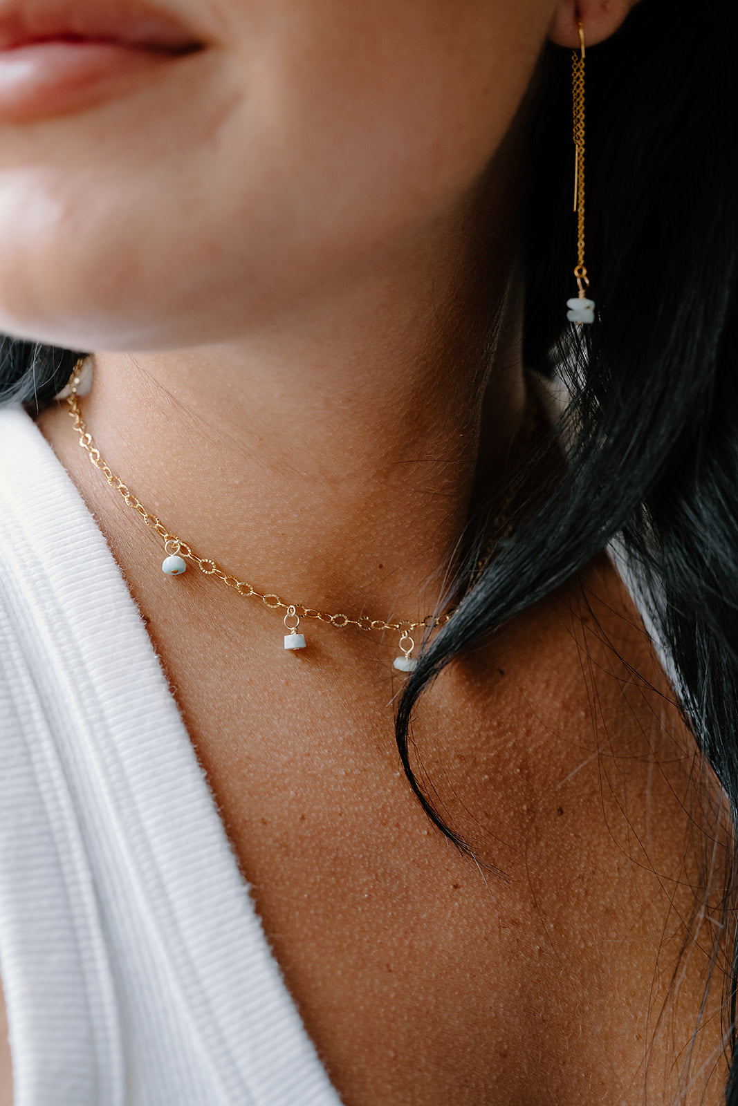 Sits just above the collarbone. A timeless, flattering length that works beautifully with almost any neckline — perfect for everyday wear.